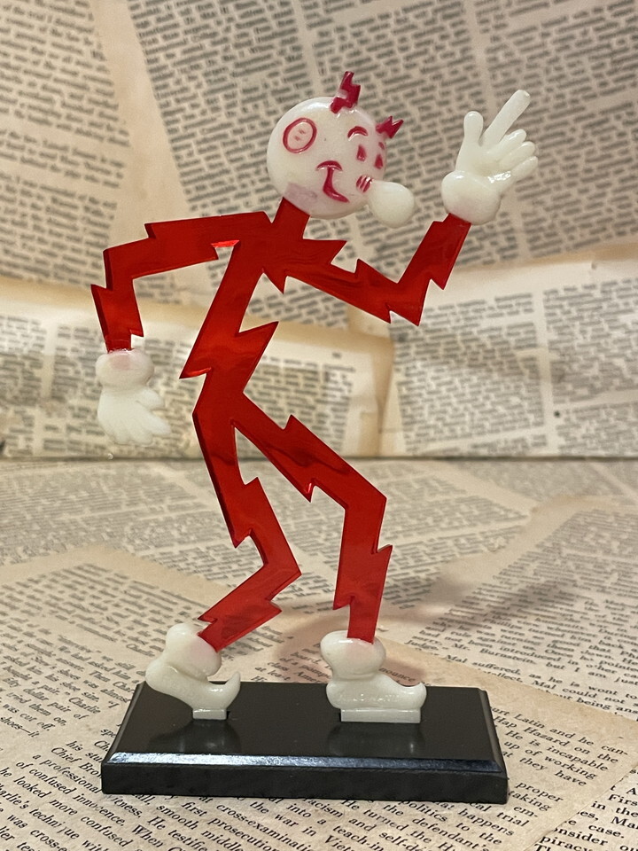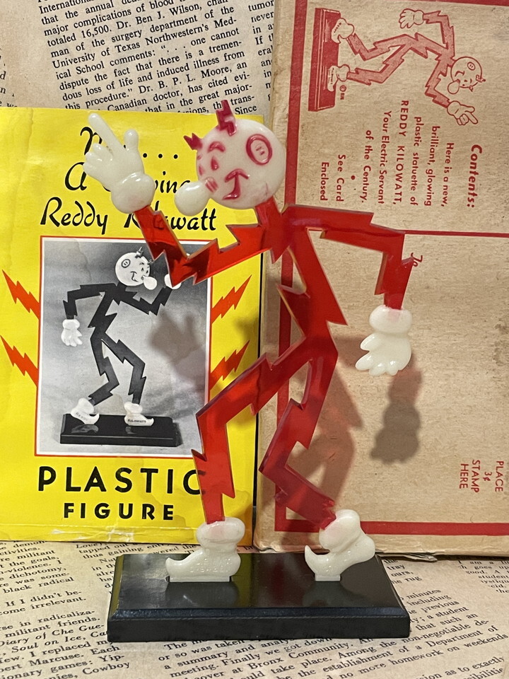 レディキロワットのプラスチック製カードホルダー卓上フィギュアです企業物コレクションにいつかは欲しいアイテムですね。こちらは蓄光バージョンとなります。定かではありませんが初版が40sで、こちらはその後に作られた物だと思います。蓄光素材の普及を考えても50s中頃辺りかなぁ。