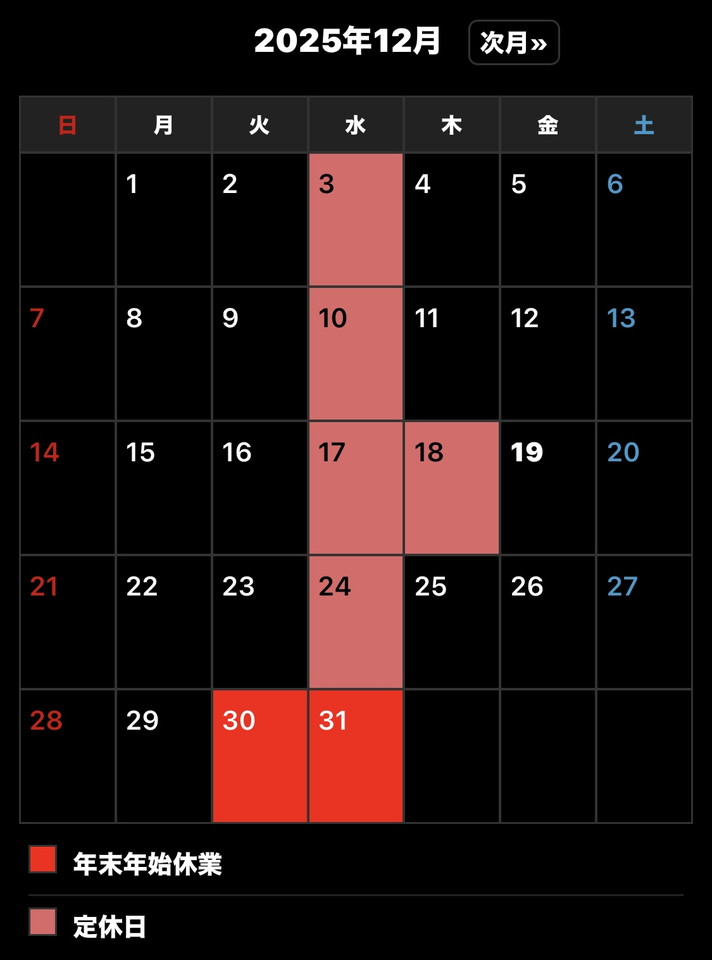 当店の年末営業はご覧の通りです。29日まで通常営業(水曜定休)となりますのでどうぞよろしくお願い致します☆