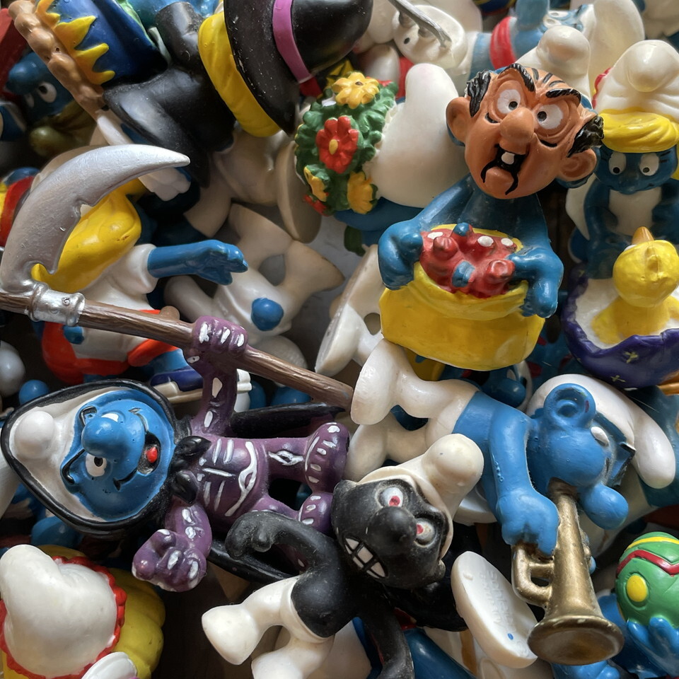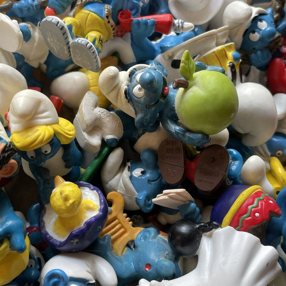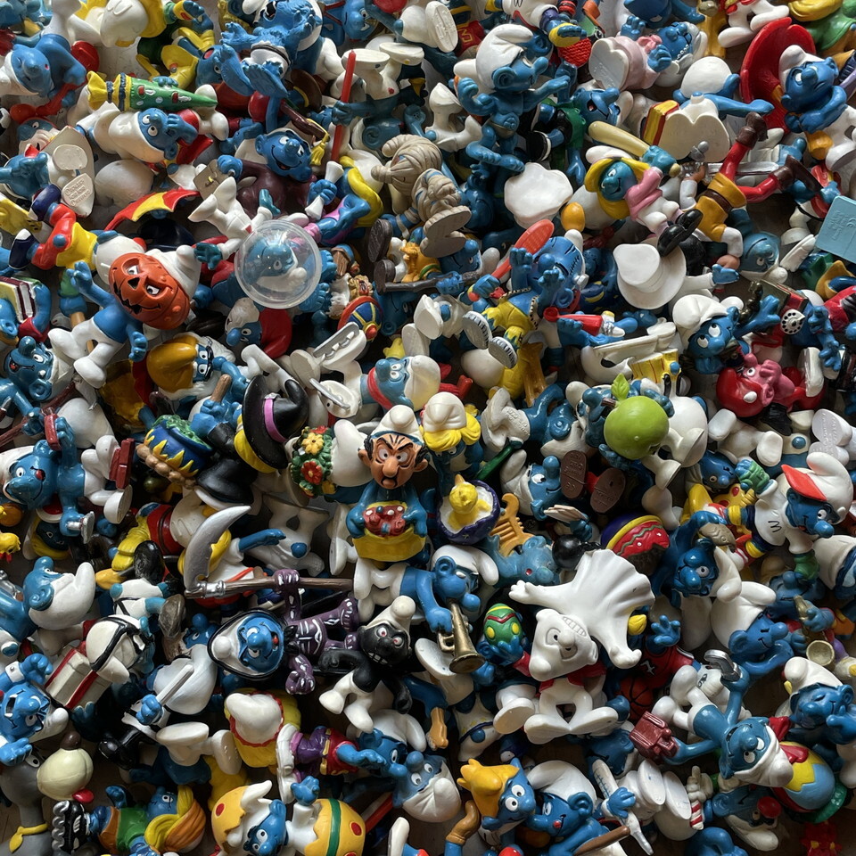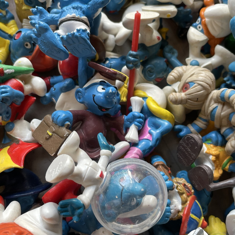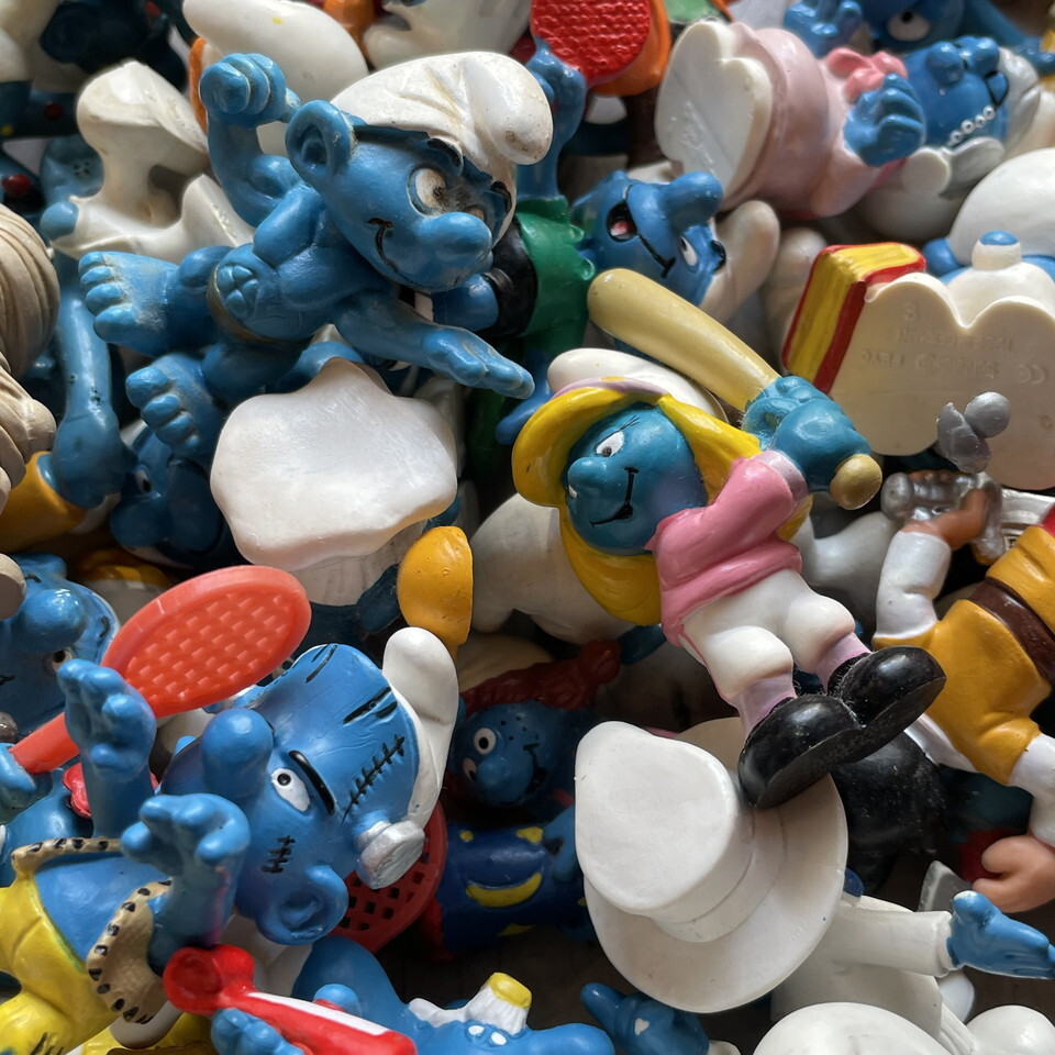 どっさりもりもりスマーフ入荷です!画像に収まりきらない程に大量~!すでに当店にはかなりの数の在庫あるんですけど徐々に減ってた事に内心ソワソワしていたんです。またがっつり補充出来て嬉し~♪ちなみにこの画像にダブリはありません!