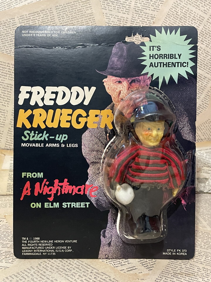 80年代に発売されたフレディ!吸盤付きでぶら下げられるStick-upフィギュアです☆映画公開から数年経ってから発売されたアイテムですが、80sホラー映画物、そしてフレディ物としても初期の立体です。